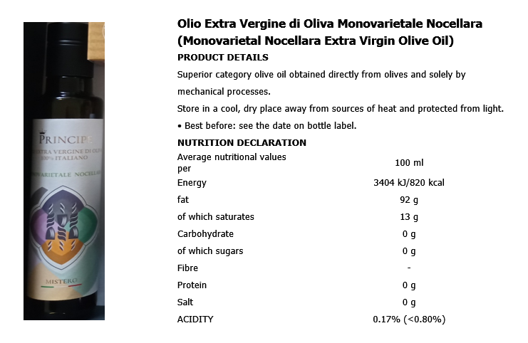 • Olio Extra Vergine di Oliva Monovarietale Nocellara (Monovarietal Nocellara Extra Virgin Olive Oil) 250ml,