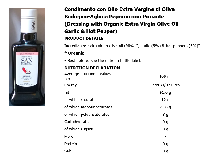 • Condimento con Olio Extra Vergine di Oliva Biologico-Aglio e Peperoncino Piccante (Dressing with Organic Extra Virgin Olive Oil-Garlic & Hot Pepper) 250ml,