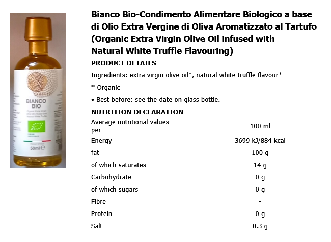 • Bianco Bio-Condimento Alimentare Biologico a base di Olio Extra Vergine di Oliva Aromatizzato al Tartufo (Organic Extra Virgin Olive Oil with Natural White Truffle Flavouring) 50ml,