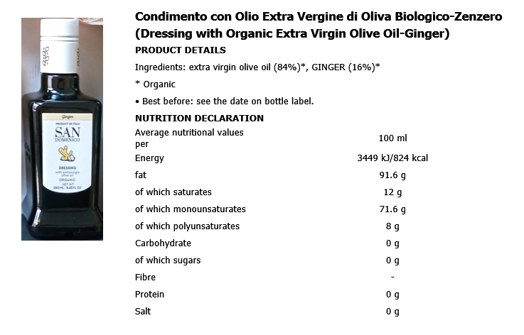 • Condimento con Olio Extra Vergine di Oliva Biologico-Zenzero (Dressing with Organic Extra Virgin Olive Oil-Ginger) 250ml,