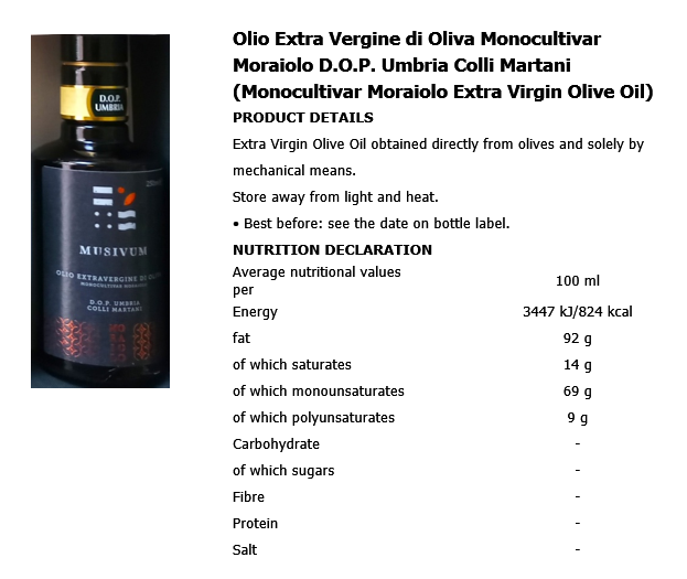 • Olio Extra Vergine di Oliva Monocultivar Moraiolo D.O.P. Umbria Colli Martani (Monocultivar Moraiolo Extra Virgin Olive Oil) 250ml