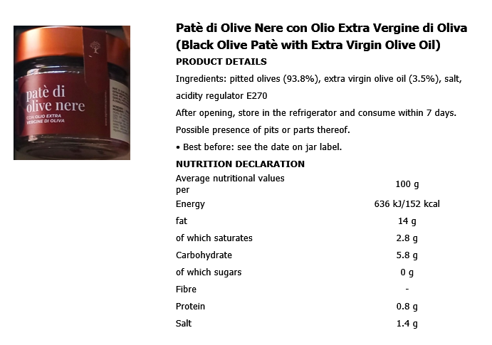 • Patè di Olive Nere con Olio Extra Vergine di Oliva (Black Olive Patè with Extra Virgin Olive Oil) 180g,
