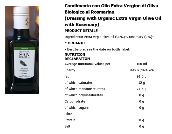 • Condimento con Olio Extra Vergine di Oliva Biologico al Rosmarino (Dressing with Organic Extra Virgin Olive Oil with Rosemary) 250ml,