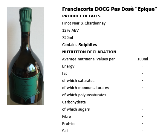 • Franciacorta DOCG Pas Dosè "Epique" 12% ABV (Pinot Noir & Chardonnay) 750ml